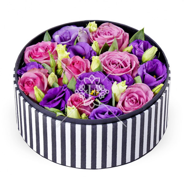 Невозможно устоять, глядя  на это цветочное совершенство! Сочетание  нежных  розовых роз, очарование насыщенно-фиолетовых  эустом, оформленных в подарочную коробку выглядит восхитительно!