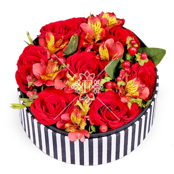 Очаровательная  альстромерия и классические розы в притягательной алой гамме, оформлены в  чудесную подарочную коробку. Словно мотив любви звучащий в нежных признаниях, цветы окутывают своим пьянящим ароматом и выглядят восхитительно!